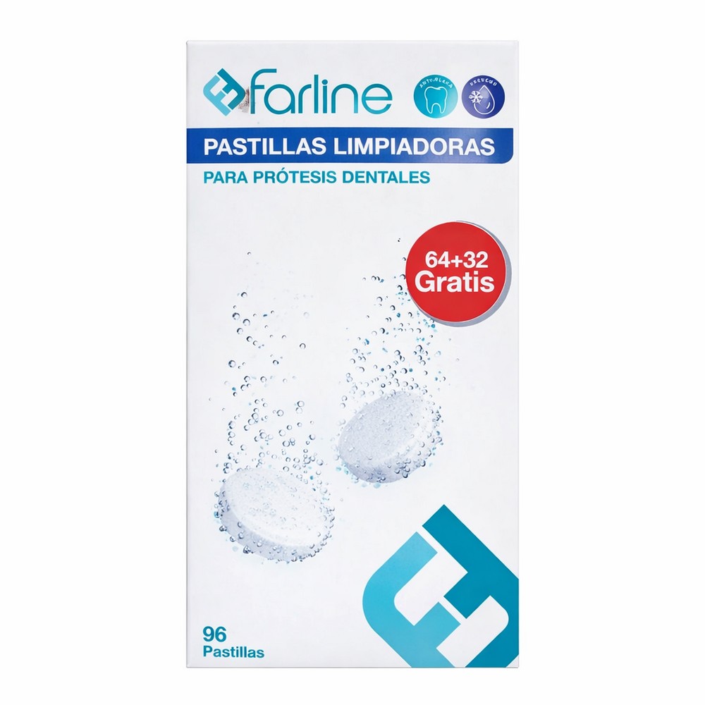 Farline Pastilhas de Limpeza para Próteses Dentárias 96 (64 + 32 grátis) — Higiene e Frescura Profunda